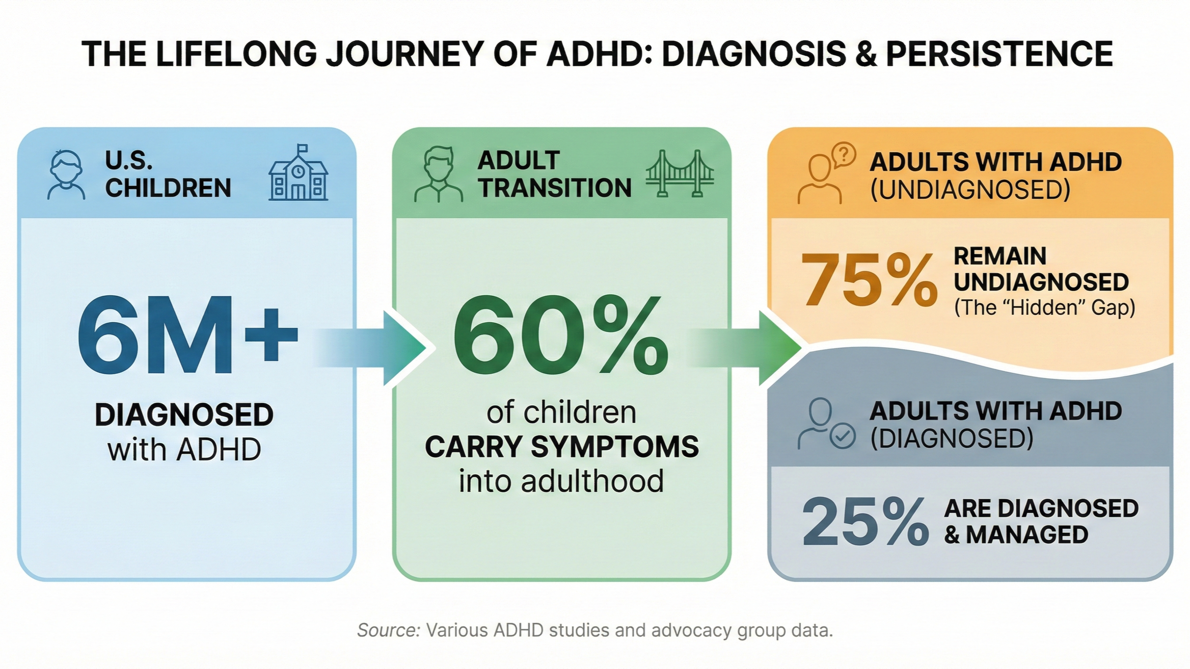 Approximately 60% of children with ADHD continue to experience clinically significant symptoms into adulthood. Many adults receive their first diagnosis in their 30s or 40s, after years of unexplained difficulty with focus, organization, and emotional regulation.